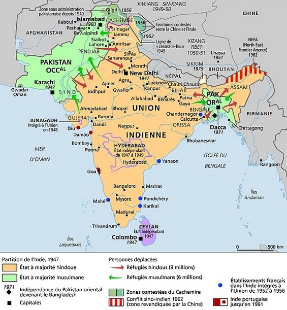 son territoire. Le mouvement indépendantiste mené par Gandhi se conçoit comme inspiré de la sagesse traditionnelle héritée de l’hindouisme ; la religion et la culture hindoues seront au centre des revendications par le peuple indien de spécificité et donc de souveraineté politique. Cependant, si Gandhi lui-même considérait que les musulmans faisaient partie de l’histoire de l’Inde et avaient leur place au sein d’un État indien indépendant, la majorité des militants de l’indépendance hindous penchaient à l’inverse pour un suprématisme hindou, considérant aussi l’islam comme une civilisation étrangère à l’Inde. En outre, la population indienne continuait d’être agitée par des tensions entre communautés hindoues et musulmanes. La partition de l’Inde, qui entérina l’incapacité des deux communautés religieuses à s’entendre politiquement, fut l’occasion d’émeutes et de violences, notamment lors des échanges de populations en 1947.